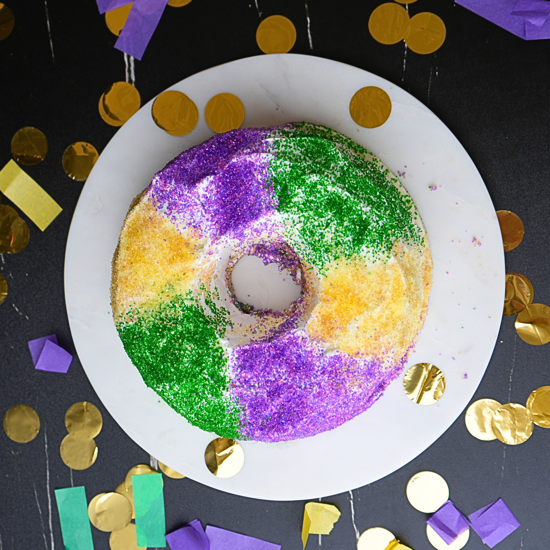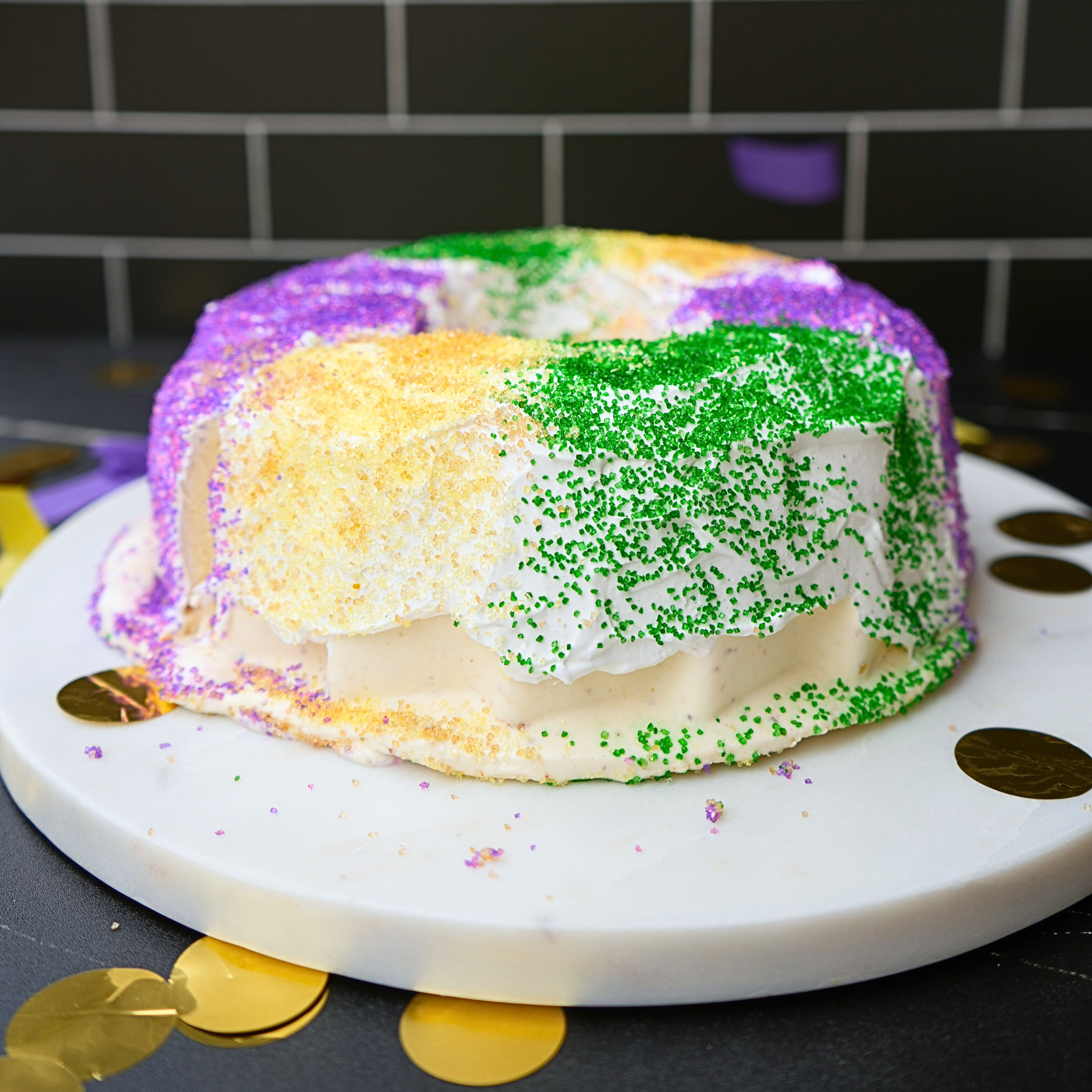 Celebrate Mardi Gras with our version of the traditional King Cake! Our Cinnamon French Toast ice cream (Cinnamon French Toast ice cream with maple syrup and a house-made croissant crumble) in the shape of a bundt cake, decorated as seen in the photos.... with one gummy bear inside for whoever is lucky enough to be crowned "king" or "queen" of your celebration!