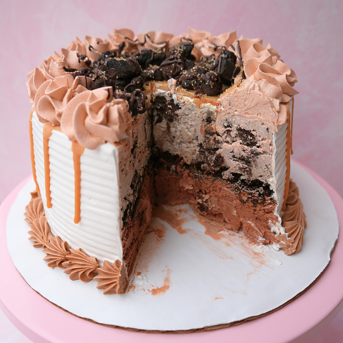 One layer of Brownie Batter ice cream and one layer of Oreo Cookies & Cream ice cream, with cookie crunchies in the middle. Topped with a layer of peanut butter sauce and brownie bites. Decorated as seen in the photos.